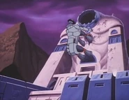 In the meantime, the Warbot fires huge chains which attach themselves to the Cats Lair's head and pulls out the entire head of the fortress. The robot then jumps onto the lair and fires a grey substance at the ThunderCats which turns them all into statues. At that instant, Lion-O arrives back at the lair and uses the Sword of Omens to free his fellow ThunderCats. He then turns the sword on the robot and pushes it away from the lair. Lion-O shoots out of the lair using the Ballista and lands near the Warbot's feet. As the robot raises its giant foot to crush Lion-O, the young lord inserts his sword into a small red disc on the Warbot's foot. This causes the robot's foot to explode and the entire robot gets destroyed.